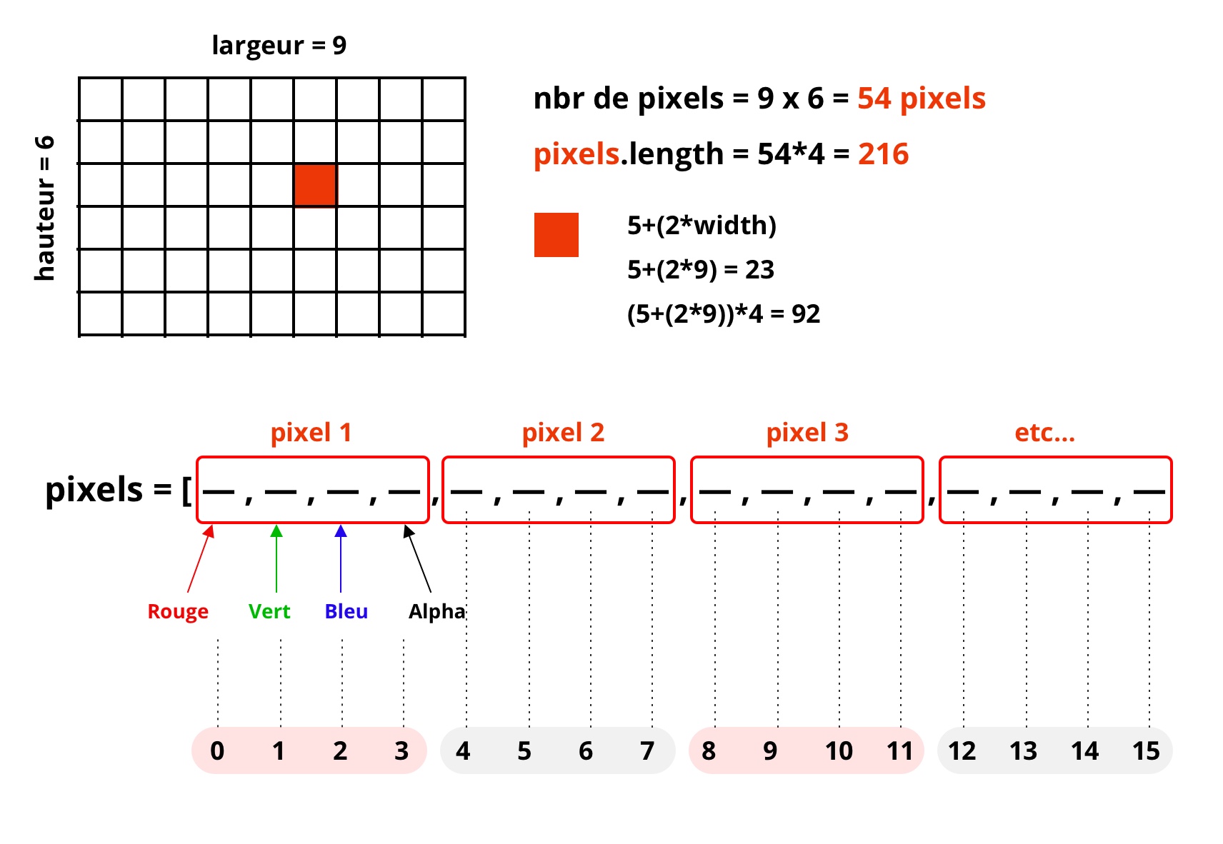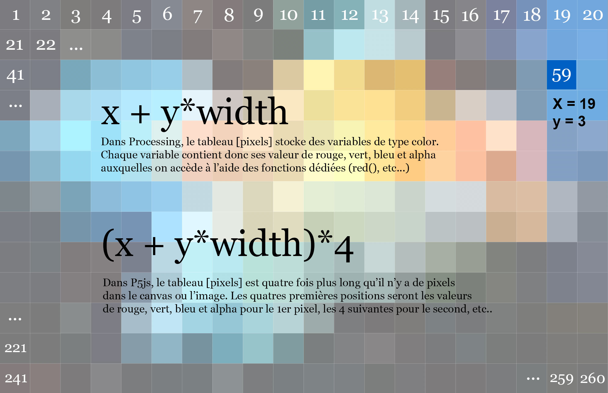 }Les formules respectives, dans Processing et P5js, pour accéder à l'emplacement d'un pixel particulier dans le tableau des pixels du canvas ou d'une image.