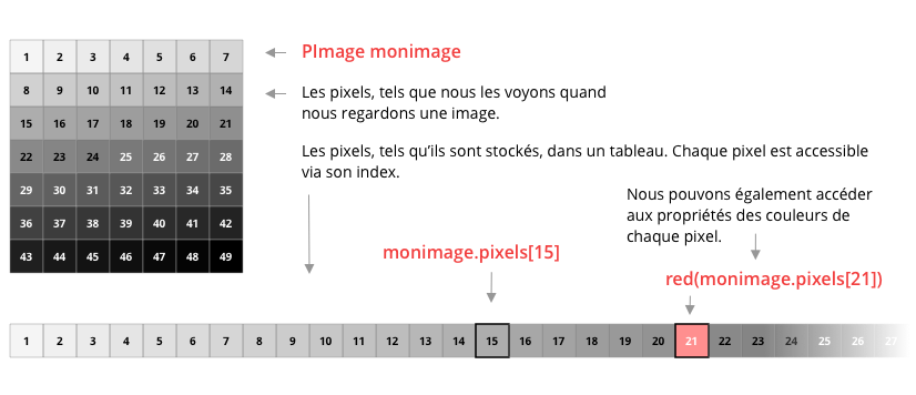 La fonction loadPixels() de Processing charge, par défaut, l'ensemble des pixels de l'espace de dessin et les place dans un tableau. Nous pouvons par la suite accéder aux valeurs de rouge, de vert et de bleu de chaque pixel, ainsi qu'à leur teinte, luminosité ou saturation, en utilisant l'index (position) de chaque pixel dans le tableau.