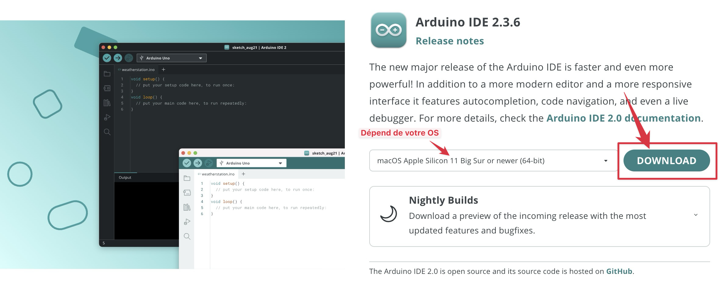 - Rendez-vous sur la page des téléchargements Arduino ou ici. Et suivez les instructions en fonction de votre OS.