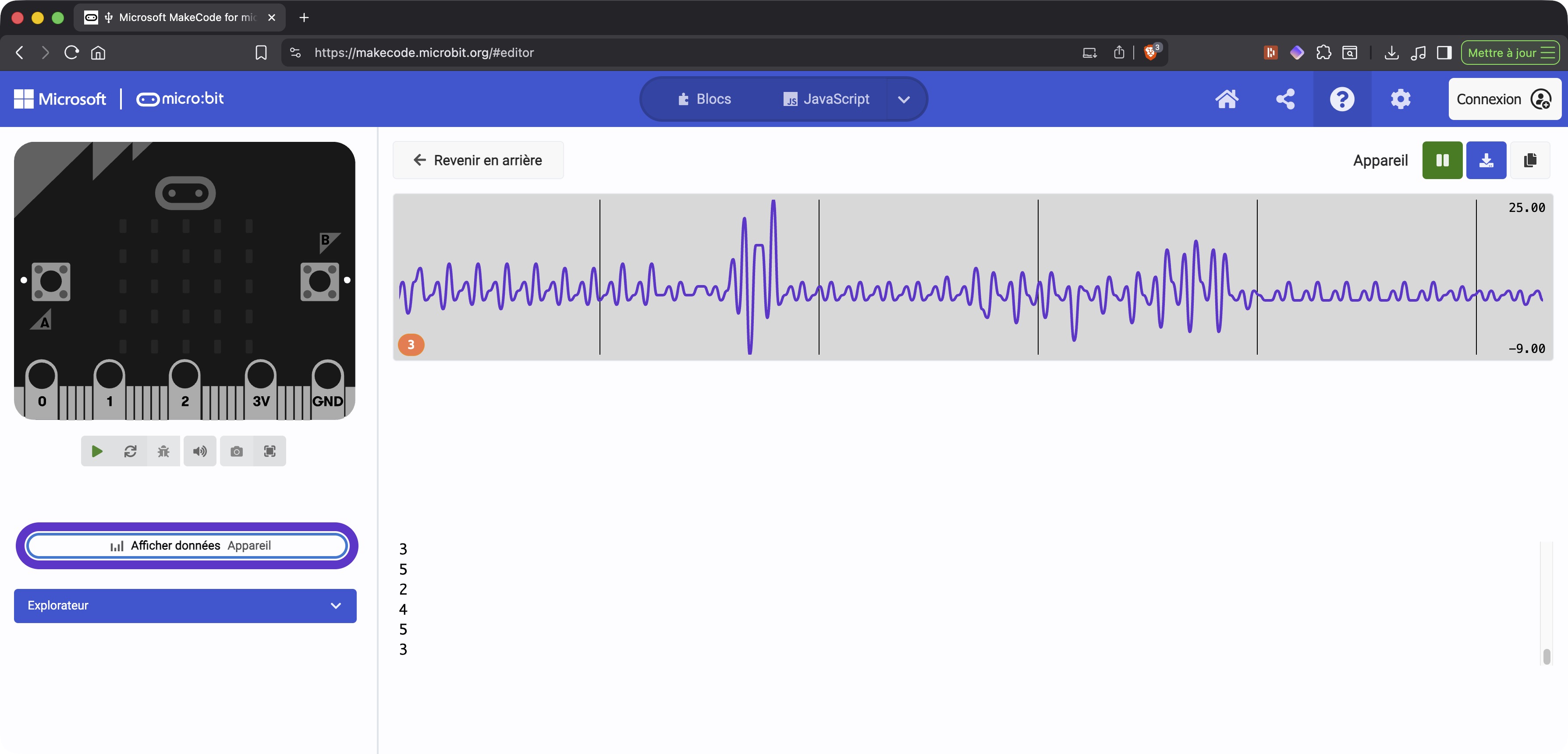 })Téléchargez le code sur la carte et cliquez sur Afficher données appareil. Cela va ouvrir l'équivalent du Moniteur série de l'IDE Arduino. C’est là qu'on va voir ce qu'on envoie avec serial.writeLine(...)
